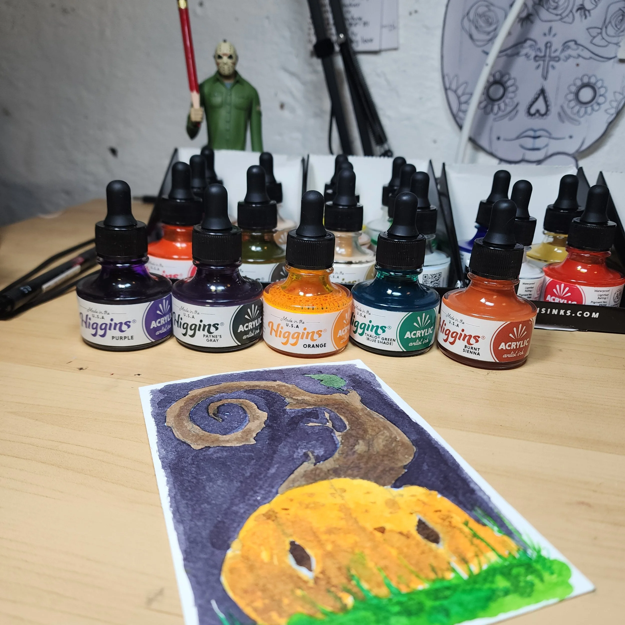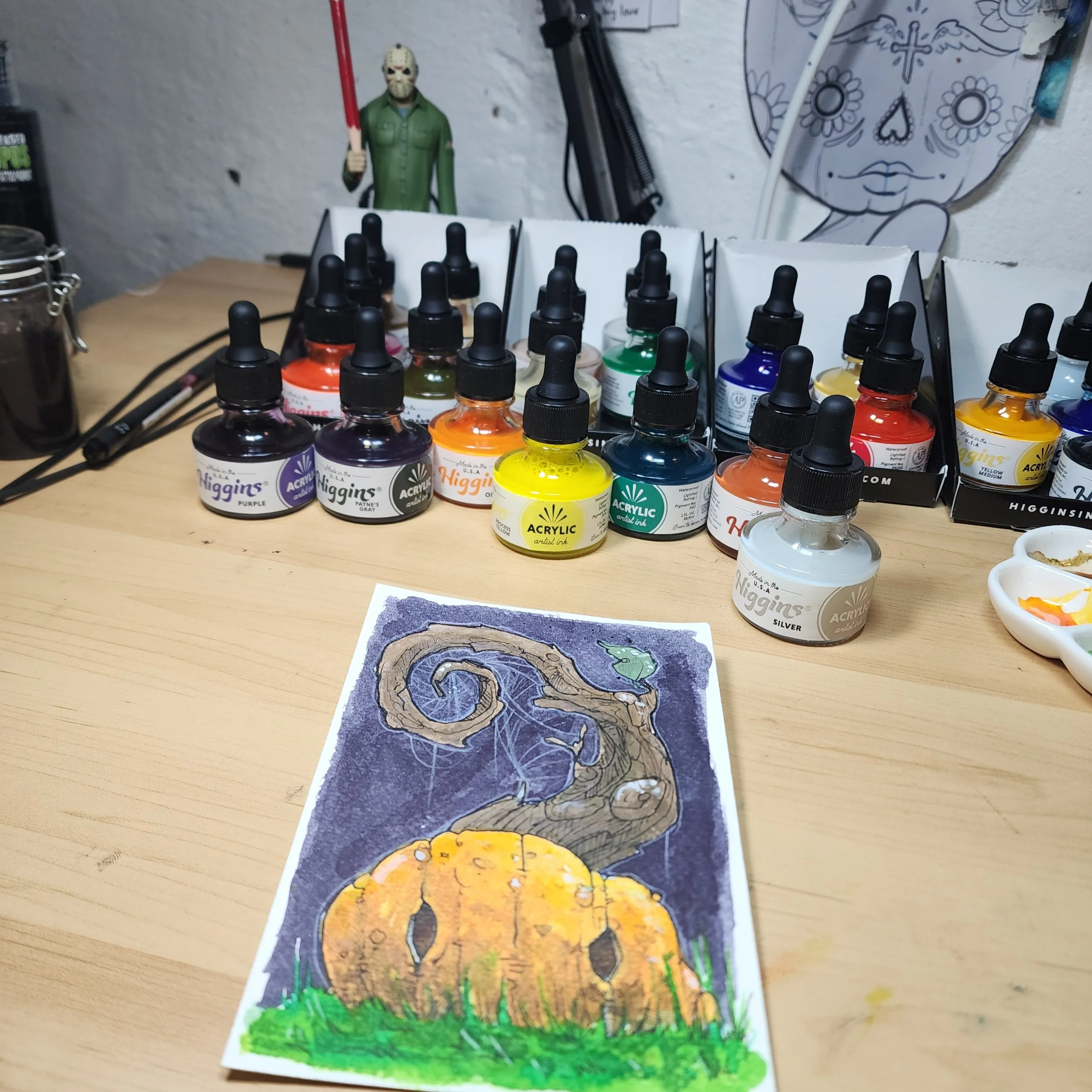 Great piece to work on for the spooky season. Used Higgins Acrylic Inks on Fabriano watercolor postcards. Great combo. Cards are 4x6in Cold-pressed.