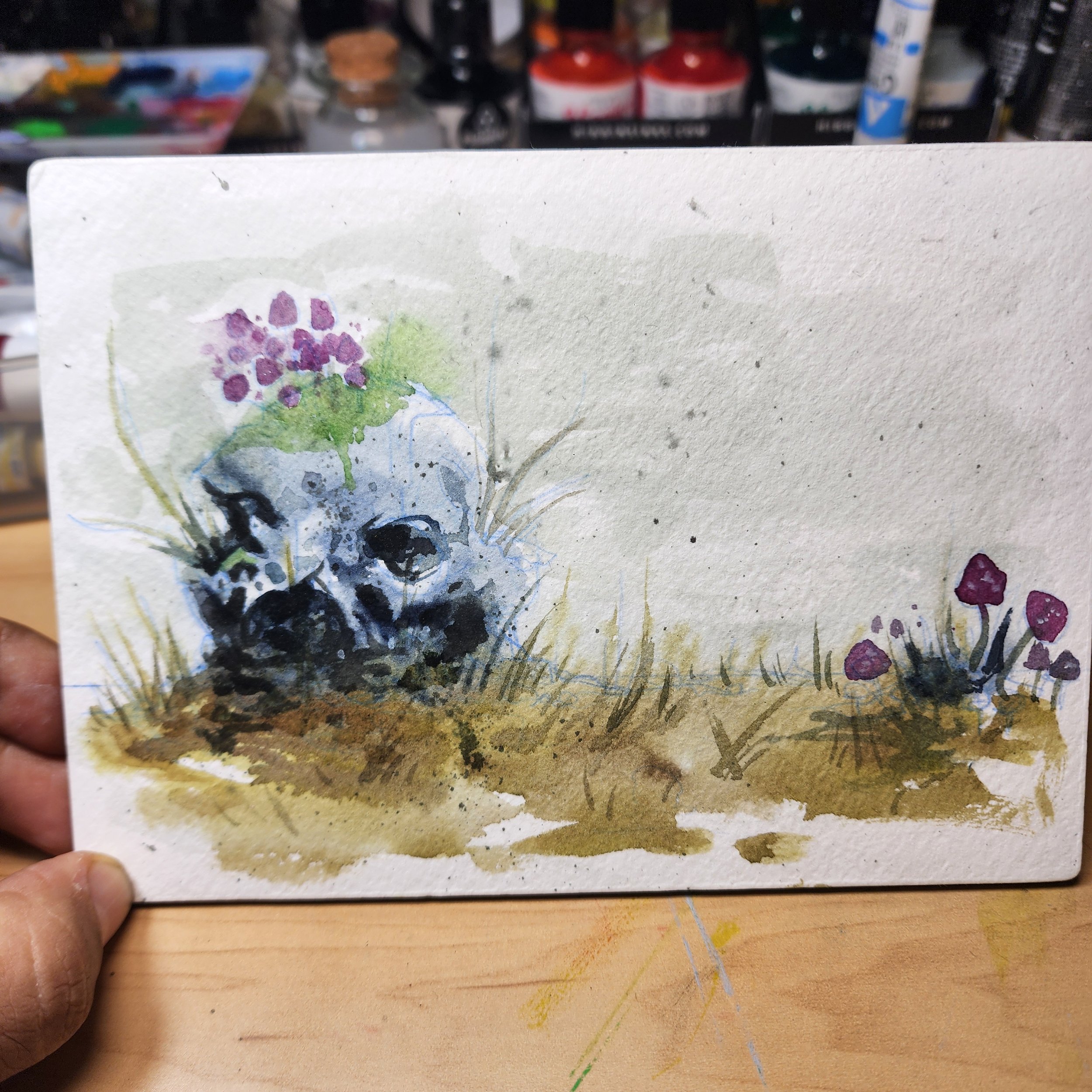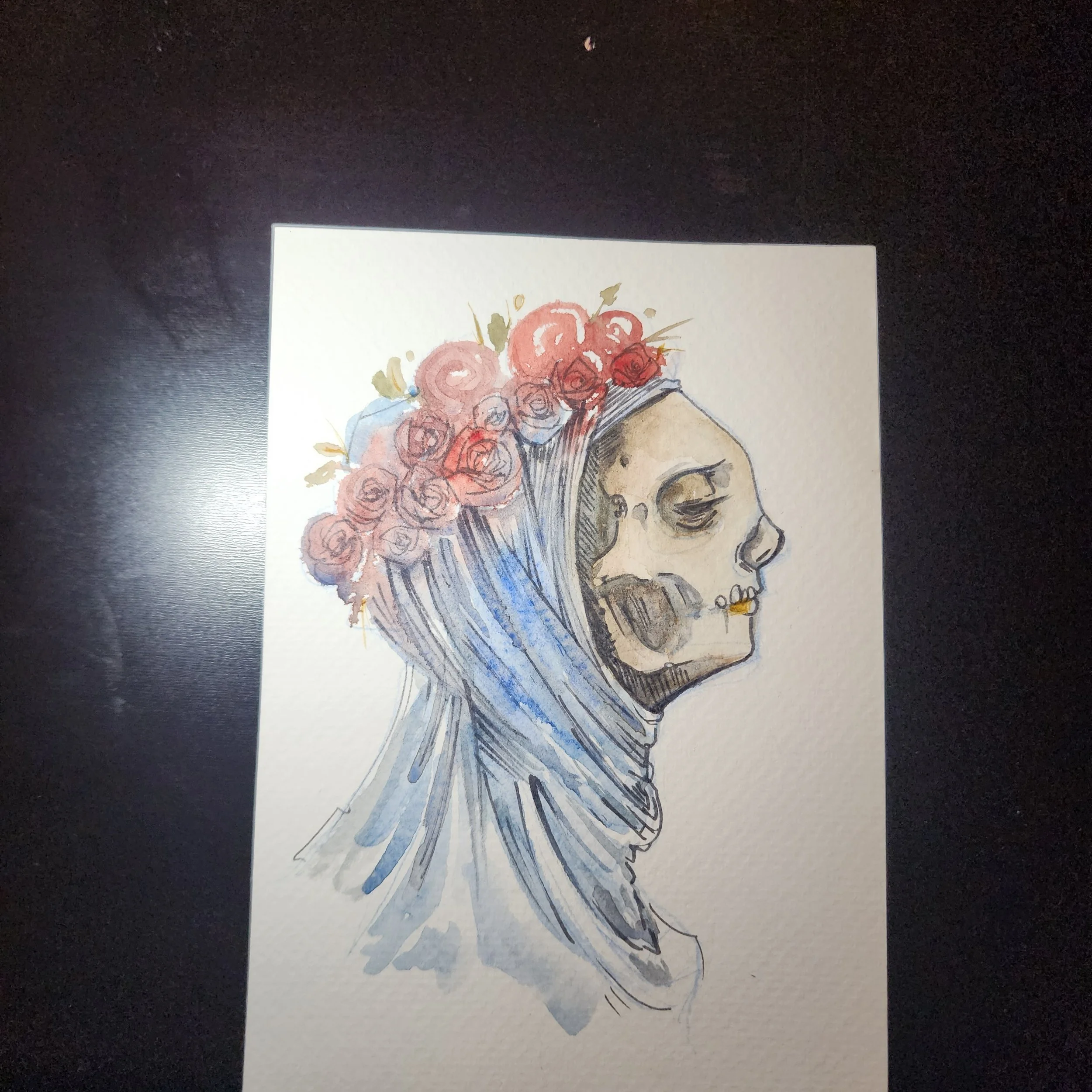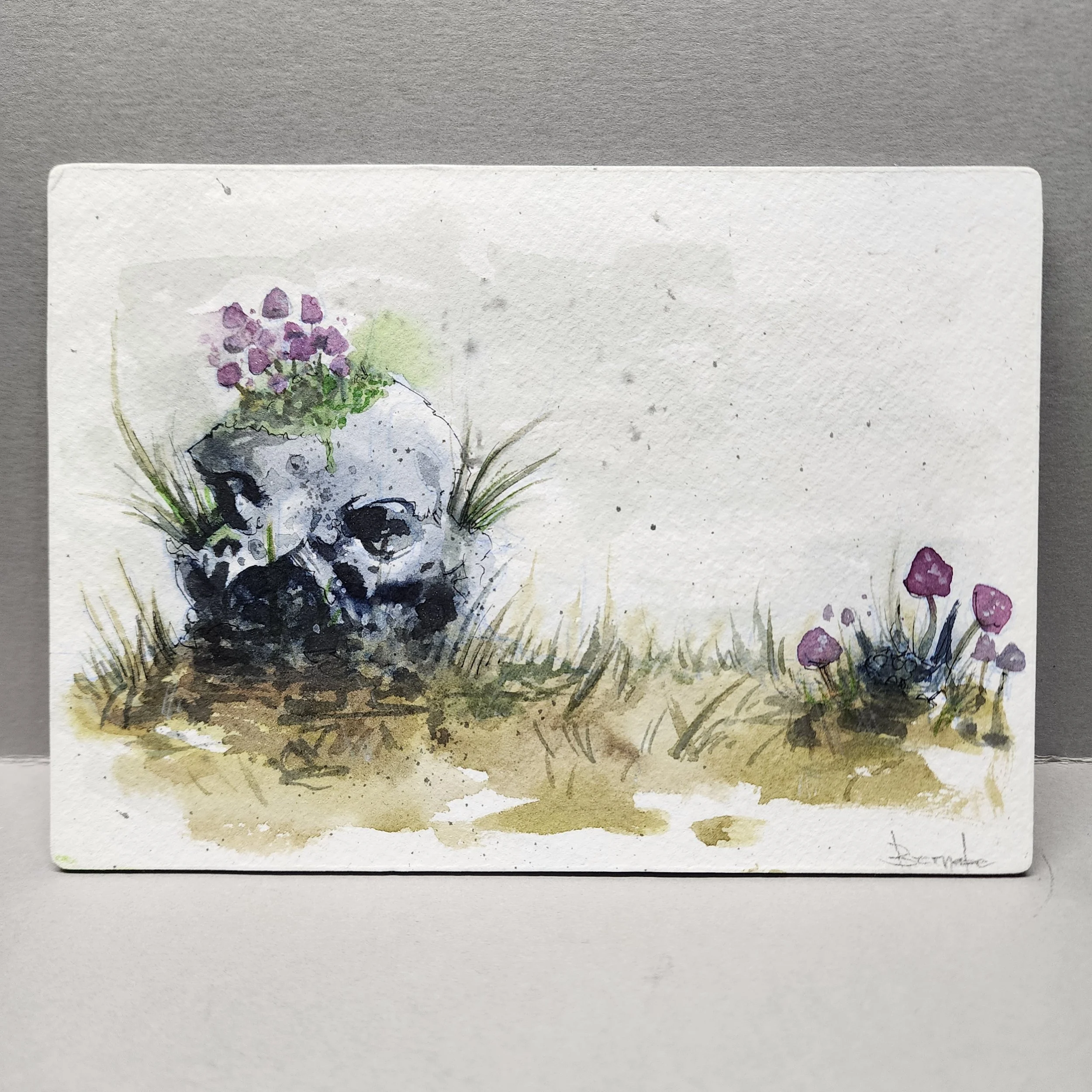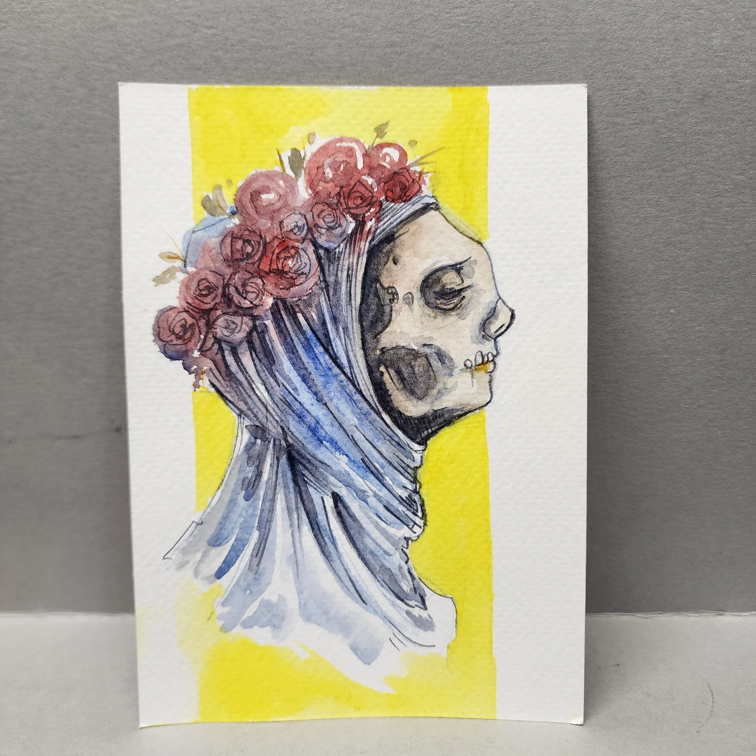 Don’t miss out on this very festive holiday Zombie Elf. Great to set the mood for in any decor. Done on Hahnemuhle Agave watercolor paper using watercolor inks. 6×9